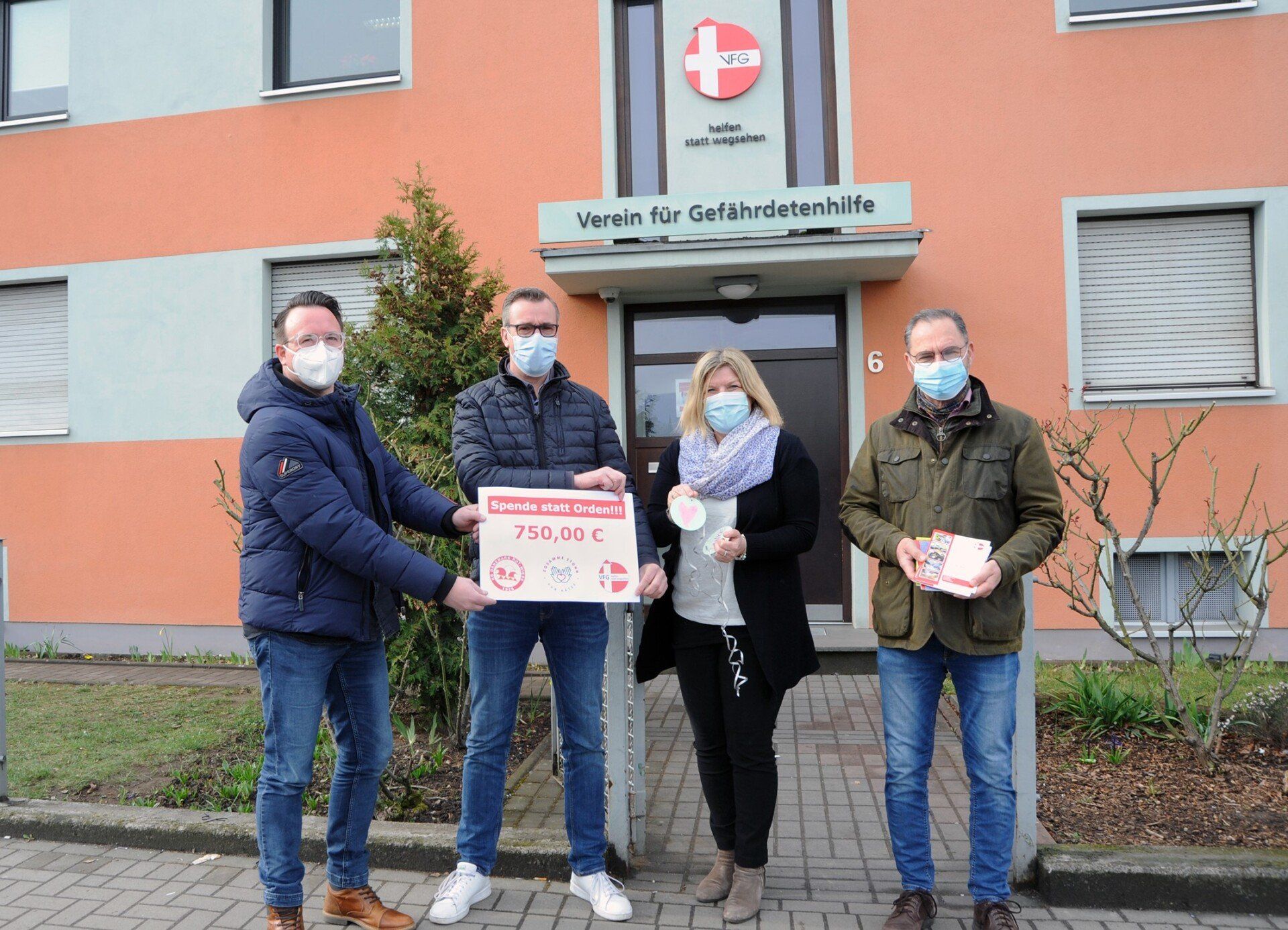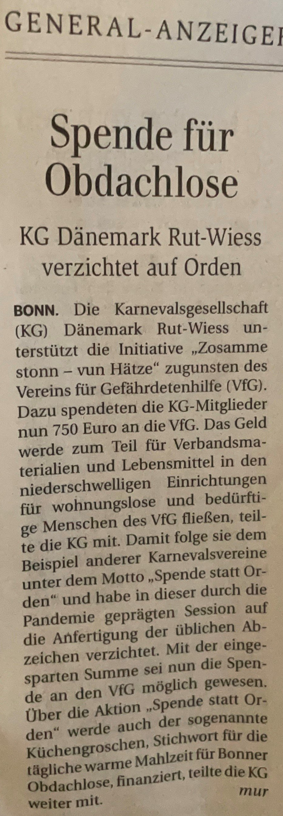 Nach kurzer Rücksprache im Elferrat waren wir uns alle sofort einig, dass der für die Orden eingesparte Betrag in Höhe von 750€ über die Initiatoren von „Zosamme stonn - vun Hätze“ an den Verein für Gefährdetenhilfe gespendet werden soll.
